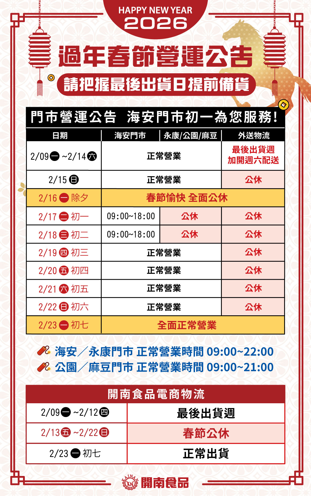 【 開南食品2026農曆春節營業公告】