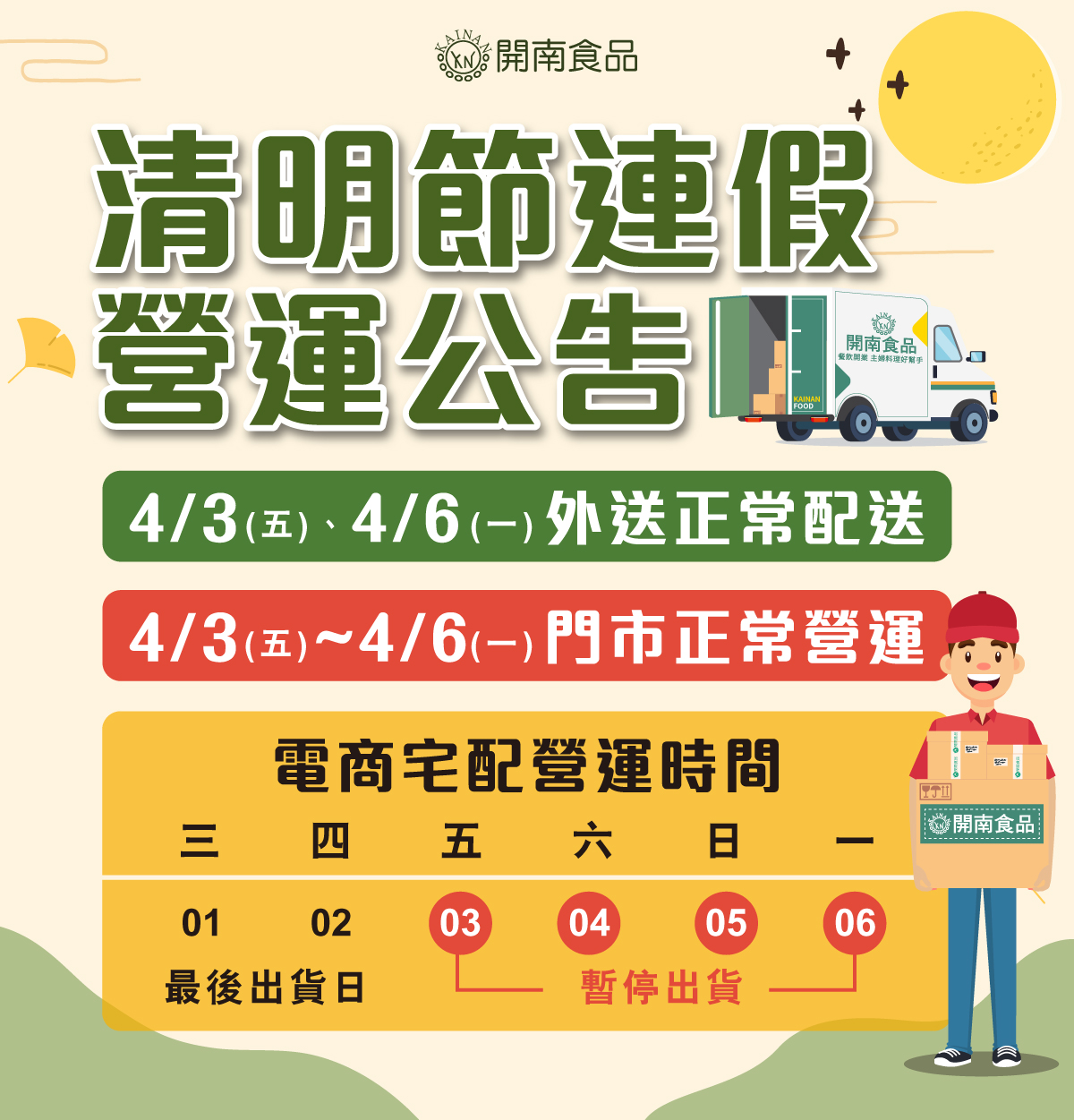 【開南食品2026清明連假營運公告】